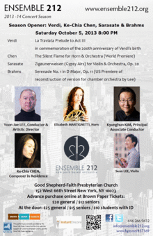Ensemble 212 opens its 2013-14 Season with Verdi's intensely lyrical Prelude to Act III of La Traviata as a tribute to the composer's 200th Birthday. Core member Elizabeth Martignetti will perform the world premiere of Composer in Residence Ke-Chia Chen's The Silent Flame for horn & orchestra, followed by Residence Ke-Chia Chen's The Silent Flame for horn & orchestra, followed by Sarasate's dazzling showpiece Zigeunerweisen (Gypsy Airs) with violinist Sean Lee. The concert will conclude with Brahms' youthful Serenade No.. The concert will conclude with Brahms' youthful Serenade No. 1 in D Major in the US premiere of Lee's reconstruction of the earlier version for chamber orchestra.
