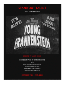 Directed by Jason Bortz Choreographed by Jennifer Bortz Featuring: Steve Campbell Dr. Frankenstein Katie Poplawski Inga Spencer Peterson Igor Jennifer Bortz Elizabeth Mary Young Frau Blucher