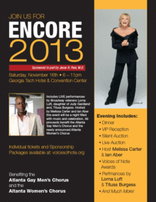 Acclaimed Broadway artists Lorna Luft, daughter of the legendary Judy Garland, and Tituss Burgess will be the very special guest performers at Encore '13, a special evening Saturday, Nov. 16 benefitting the Atlanta Gay Men's Chorus and its newly formed sister chorus, the Atlanta Women's Chorus. The popular catered event, launched in 2010, will again be hosted by the LGBT community's own DJ Melissa Carter, joined by comedian Ian Aber. The event will again be held at The Georgia Tech Hotel and Conference Center in Midtown Atlanta.