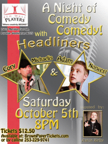 Yes, you heard right. Masters of Comedy Adam Norwest and Cory Michaelis will duel it out on the 4th Wall Players Stage October 5th at 8PM. Aaron Kirby will host and referee this battle of the hottest comics in the Northwest. Get your tickets now as this show is certain to sell out our intimate black-box theatre. Premium stage-side tables and every night beer/wine specials await. Choose your favorite comic in this Battle Royal and cheer them on at the 4th!