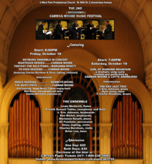 honors composer/conductor and recent Guggenheim Fellowship winner Carman Moore. Moore will lead his renowned SKYMUSIC ENSEMBLE in a program of works by him and by Ensemble members Kenneth Bichel and Marianna Rosett on October 18th at 8p.m.at Manhattan's West Park Presbyterian Church . And at West Park on the following evening of October 19th at 7 p.m. he will play keyboard and Danish actress and vocal star Lotte Arnsbjerg will sing as they perform the world premiere of their "dramatic song cycle" GIRL OF DIAMOND MOUNTAIN . Closing that evening the high-powered EKG Trio (pianist Eric Johnson, bassist Kyle Jones, and SKYBAND drummer F.Carter Hoodless,drums) will perform their own and standard pieces along with special arrangements of Mr. Moore's and late Skymusic violinist Leroy Jenkins' music.