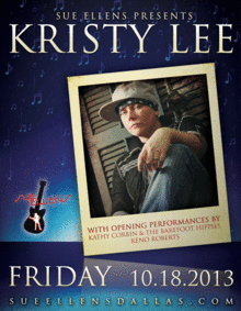 Kristy Lee returns to Sue Ellen's on October 18th, with opening bands Barefoot Hippies and Reno Roberts. Doors open at 7pm, 18+ welcome.
