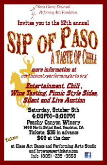 Hosted by Peachy Canyon Winery - at Bethel and 46 West - A Sip of Paso helps the NCDPAF (North County Dance and Performing Arts Foundation) raise funds to support community productions such as the holiday classic "The Nutcracker" (coming Dec 6 - Dec 15) and our Spring Production, April 2014. Join us from 4:00 - 8:00 pm, October 5, 2013 for a rompin' good time, featuring chili from prominent local restaurants, wine tasting from some of the communities top vintners, entertainment from members of the Paso Robles Ballet and Jazz companies and so much more!