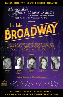 "Lullaby of Broadway," a musical revue at the Memorable Affairs Dinner Theatre at Warminster's Five Ponds Golf Club features the biggest hits from Broadway. Featured songs are from such legendary productions as La Cage aux Folles, Sweet Charity, Phantom of the Opera, 42nd STreet, A Chorus Line, Spamalot, Cats and many, many more.