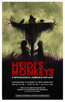 Heidis Monkeys is a psychological horror about a young girl whose world descends into madness in the sixth edition of this stunning, tension- filled thriller. This live theatrical performance will be happening outside under the full Sonoita moon. Come early for Mead, Food, and Free Tarot card readings. Show begins at 7pm.
