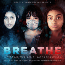 North Atlanta Drama presents Breathe: A Virtual Musical Theatre Showcase. This uplifting and timely show features dance and vocal performances, original poetry and scenes, and visual art pieces that speak to the heart of our collective pandemic-era experience. We would be most honored if you joined us for a night "at the theatre." Since we can't be together, we will bring the theatre to you on October 22nd at 8:00 pm. Run time is approximately 1 hour. Show is appropriate for all ages.