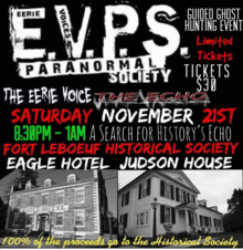Join Eerie Voices Paranormal Society for a night of investigating at the historic Judson House and Eagle Hotel on the grounds of where Fort LeBoeuf was built in 1753. You may have a potential run in with an old French Soldier, previous hotel guests, or maybe a member of the Judson family. Learn about paranormal investigating, the techniques, experiments, and the equipment used prior to your investigation of this historic site. Do you dare....?
