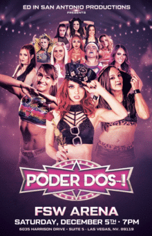 Ed in San Antonio Productions presents PODER DOS~! Dec 5th Las Vegas FSW Arena 6035 Harrison Drive suite 5 Las Vegas NV 89119 Featuring stars like Priscilla Kelly, Chris Bey, Nicole Savoy, Delilah Doom, the debut of Kaia McKenna and many more. Tickets $35 front row, (45 tickets) $30 second (10) $25 bleacher seats (60)
