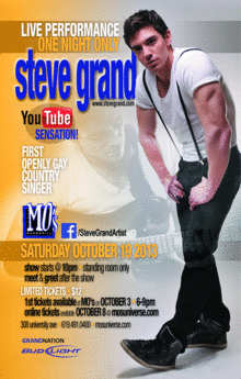 The summer wind blows in again for ONE NIGHT ONLY with Steve Grand at MO's Universe at on Saturday, October 19th 2013 for Kickers Country Night. Steve Grand will deliver a full concert set at Urban MO's Bar & Grill - The Best Gay Bar In The World - showing San Diego how Midwest boys like to party with his hits "All American Boy" and smash follow up "Stay". A meet & greet for ticket holders will follow his performance.