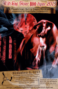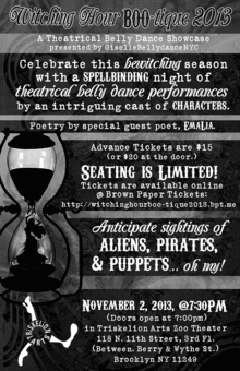 Witching Hour Boo-tique 2013: A Theatrical Belly Dance Showcase presented by GiselleBellydanceNYC Celebrate this bewitching season with a spell binding night of theatrical belly dance performances by an intriguing cast of characters. Poetry by special guest poet, EmaLia. Anticipate sightings of aliens, pirates, and puppets ... oh my!