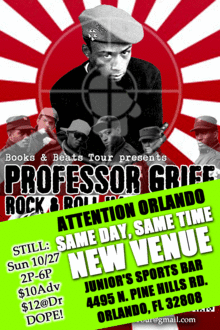 Come join us as we Celebrate PROFESSOR GRIFF of Public Enemy's Rock N Roll Hall of Fame Induction! TAHIR RBG, SA-ROC, PRECISE SCIENCE, & KALONJI CHANGA will be in the spot givin it all they got! Orange/Seminole County Hip Hop come thru and show your love & support for one of our true heroes! This event WILL sell out so get your tix in advance. For tickets/vending/sponsorship/booking contact BooksBeatsTour@gmail.com