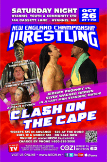 The debut event entitled "CLASH ON THE CAPE" will feature two championship matches, among the seven bouts on tap. In the main event, former NECW Heavyweight Champion, Slyck Wagner Brown battles the Canadian Sensation, Jeremy Prophet in a "Last Man Standing Match." Brown & Prophet have been locked in a bitter feud for much of the past year. Their matches have been among the most intense athletics bouts in NECW history with neither man gaining a clear advantage over the other. In this bout, there are no count outs, no disqualifications, no pinfalls or submissions. The match continues until one man cannot get to his feet by the count of ten. NECW Television Champion, Mashpee's own, Johnny Thunder, puts his title on the line against "The Masshole" Mike McCarthy in a Cape Cod Lumberjack Match. In this bout, wrestlers surround the ring. Should either man be thrown or try to make their way to the outside, the wrestlers (the "lumberjacks" in this case) will throw the man back into the ring. In addition, should any man wish to try and get into the ring to interfere in the match, they will keep them out.