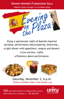 SERVE Fall Fundraising Gala "Evening on the Plaza" Saturday, Nov. 2, 6 pm Tickets: $60 per person Unity on the North Shore Purchase your tickets today for a spectacular night of Spanish- inspired partying, performance, and prosperity! A light dinner will be served along with appetizers, sangria and dessert. Enjoy a live auction, raffle and a special Flamenco dance performance by our very own Lori Willer. Lori has studied this very expressive, dramatic, and colorful dance for many years, as a soloist and as part of a dance troupe. Your contributions to this special event support our continuing efforts to beautify our spiritual home. Tickets can also be purchased in the atrium after service.