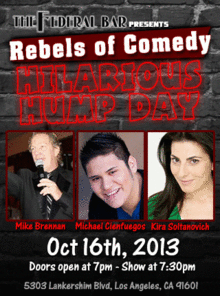 Rebels of Comedy presents Hilarious Hump Days at the Federal Bar in North Hollywood. Come out and see a night of live comedy, featuring an awesome lineup of professional features and headliner comedians. This show's headliners : Mike Brennan, Michael Cienfuegos, and Kira Soltanovich.