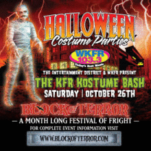 For the sixth year in a row, WKFR is back to sponsor the area's biggest and best costume party. Join Krista Hatcher and Will Harvey as they preside over the largest collection of freaks, geeks and spooky monsters in a battle for the coveted $1000 first place costume contest prize. If you've never made it to our Kostume Bash, then prepare for a parade of the most elaborate, funkiest, spookiest and craziest costumes to be found anywhere.