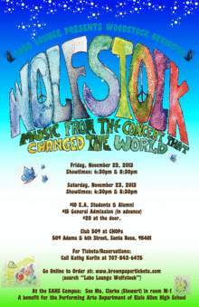 The Elsie Allen High School Performing Arts Department will be putting on another exciting show involving the collaboration of our music, theater, and dance departments as we take on the harmony, hair, and hippies of that crazy three day concert in 1969. A Cabaret Style show, featuring the Groovy sounds and scenes of the 60's and one of the most memorable events in Rock & Roll history; Woodstock! Turn on, Tune in & Drop out, as you hear songs by artists like "Jefferson Airplane", "The Who", "Crosby, Stills, Nash & Young", "Janis Joplin", "Hendrix" and more.... The show will be presented 4 times. November 22 & 23, 2013, 6:30 p.m. & 8:30 p.m.