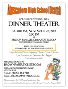 Join the Atascadero High School Drama cast and crew for a fun evening at the historic Mission San Luis Obispo De Tolosa. The evening will benefit their performances in Scotland at the Edinburgh Fringe Festival. The evening will include dinner, a Mystery Theatre Show, live and silent auctions, and a Salute to the Haggis! Beer and wine will be available.