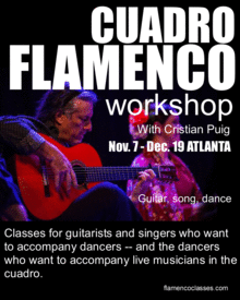 Dedicated to growing Flamenco in Atlanta, Cristian Puig returns for three weeks in November-December. He's offering classes structured for guitarists and singers who want to accompany dancers -- and the dancers who want to accompany live musicians in the cuadro. To serve everyone, the schedule is full of twists. Please read carefully --