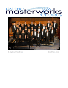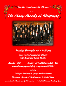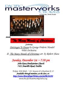Pacific Masterworks Chorus, under the fine direction of acclaimed master director Dr. Greg Lyne, is proud to present Handel's Dettingen Te Deum, along with several other holiday masterworks songs. We are pleased to be accompanied by a small chamber orchestra and our pianist Joy Tsai. There will be additional selections performed by members of our orchestra. Please come join us and kick off this joyous season with some fine music!