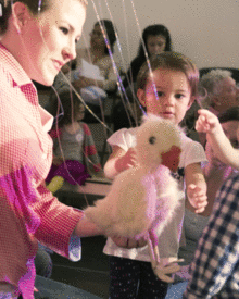 Hatched, written and directed by Mara McEwin, is the original performance of a newborn chick emerging from her shell at sunrise to a strange and busy world. Told to the youngest of audience members 0-6, it is a first introduction into the theatre, while incorporating both the museum and farm. Performed through movement, handcrafted puppets, and very little human dialogue, the story is set amidst an American family farm. The chick is met by a feisty old rooster, a wobbly calf learning to walk, a gaggle of dancing chicks, a lamb, and a noisy nest of baby birds.