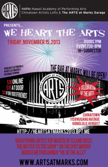 Friday, November 15, 2013 The ARTS at Marks Garage 1159 Nuuanu Avenue, Honolulu, HI 96817 (Chinatown) Doors 7pm Show 730-9pm $10 Online, $15 Door, $5 for 1001 Friends 18+ Suggested Featuring: Kip McAtee of Island Oasis, The Mister Sister Show, On The Spot Improv, DeRose Method Hawaii, Oil In The Alley Tickets Available at http://heartsatmarks2013.bpt.me More info at www.artsatmarks.com Please use the hashtags #HEARTSatMarks and #ARTSatMarks when tagging photos of the event online!