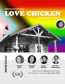 LOVE CHICKEN explores interpersonal questions of belonging, choices, and love. The main characters, Yan and Lolo, are struggling with the same challenges of friendship that so many adults do--particularly in the queer and trans communities where relationships can be difficult to classify, develop, and maintain in the context of romantic partners and growing apart. Complicating their dynamic further are Yans straight, cis husband Dave and Lolos new love interest, Max, a bartender who is more comfortable holding back than expressing themselves directly. These conflicts unfold over the span of a month--the planning and disruption of a getaway weekend, and an eventful night at Lolos apartment in the aftermath.
