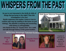So you're not interested in the thrills & chills of things that go bump in the night? Then this investigation is for you! Gentle responses and maybe a name or two to confirm who may be residing in the home (or just visiting). The afterlife is amazing and connecting with history is unforgettable. Join Denise & Ron, & "Coyote Chris" for a walk and talk through history at this great location.