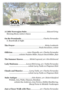 Charles Fernandez, the orchestra's conductor, composer and arranger, will premiere the 2nd movement of his flute orchestra arrangement of "On the Prominade" as well as the ever popular "Closer Walk" arrangement for Flute Orchestra. Jazz Artist, Kim Richmond, will premiere his arrangement of the theme from "Summer of '42" for the orchestra.