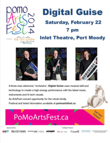 One of Canada's most hi-tech, educational and entertaining groups, Digital Guise has been performing to enthusiastic audiences for over 10 years. A three-man electronic orchestra, Digital Guise uses musical skill and technology to create a high-energy performance with the latest music, instruments and hi tech visuals. This performance will appeal to audiences young and old, and offers an ArtsFest concert opportunity for the whole family. ----