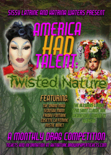 From avalanches and flash floods to venomous snakes and Katrina Waters chest hair, twisted nature is all around us, threatening the ground we walk on and pushing our gag reflexes (for those that have them) to their limits. Come safely enjoy these thorny bushes and raging waterspouts from a distance at America Had Talent: Twisted Nature presented by Sissy Latrine! Come watch 5 performers compete with the forces of Mother Nature at their sides, battling it out for cash and prizes!