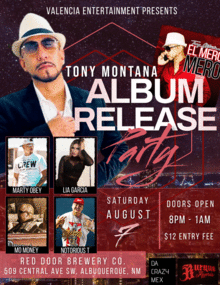 Valencia Entertainment presents TONY MONTANA ALBUM RELEASE PARTY at Red Door Brewery Downtown Albuquerque, NM! Come celebrate the release of EL MERO MERO on Saturday, August 7th, 2021.