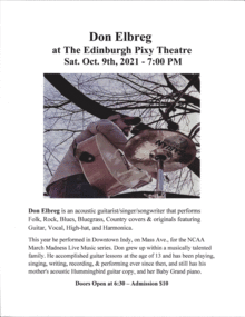 Don Elbreg is an acoustic guitarist/singer/songwriter that performs Folk, Rock, Blues, Bluegrass, Country covers & originals featuring Guitar, Vocal, High-hat, and Harmonica. This year he performed in Downtown Indy, on Mass Ave., for the NCAA March Madness Live Music series. Don grew up within a musically talented family. He accomplished guitar lessons at the age of 13 and has been playing, singing, writing, recording, & performing ever since then, and still has his mother's acoustic Hummingbird guitar copy, and her Baby Grand piano.
