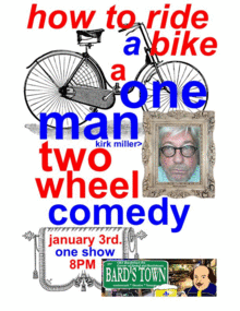 Louisville comedian Kirk Miller puts together a one-man, two-wheel comedy beginning with the bicycle...and going Lord knows where. You won't want to miss.