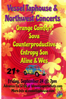 Vessel Taphouse Presents Orange Comfort, Sova, Counterproductive, Entropy Son, and Aline & Wes. @ 7pm.