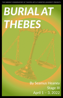 Heaney's translation of Sophocles' ANTIGONE, commissioned by Ireland's Abbey Theatre to commemorate its centennial, exposes the darkness and the humanity in the Greek masterpiece, inking it with Heaney's own modern and masterly touch. BURIAL AT THEBES stands as a timely exploration of the conflict between those who affirm the individual's human rights and those who must protect the state's security. Senior directing major Kylie Ferguson helms this capstone production.