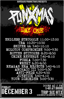 THE FIFTEENTH ANNUAL PUNXMAS FEST $35 PER DAY (IF PURCHASED AHEAD OF TIME) $60 WEEKEND PASS $40 AT THE DOOR (PER DAY - IF IT'S NOT SOLD OUT) DEC 3-4, 2021 TRIP SIX HTX 6230 Rupley Cir, Houston, TX 77087