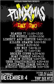 BLANKS 77 (NJ) THE WHEELZ (CO) LIBERTY AND JUSTICE KILLER HEARTS NOOGY GEN WHY DEAD 77 (CA) BROKEN CUFFS (CA) SOAP CHARGE (OK) SHADOW HOUNDS USER UNAUTHORIZED CALCULATED CHAOS SYKOTIC TENDENCIES