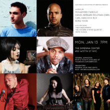 DBR curates and hosts an evening of fresh new sounds, sights and words by today's most sought after contemporary artists on January 13 at 7pm at the DiMenna Center in New York City. Co-hosted by composer Mohammed Fairouz and free to the registered arts presenters of APAP, ISPA and CMA conferences, the evening will feature works by DBR, Fairouz, writer/performer Carl Hancock Rux with vocalist/musician Theo Bleckmann, and sound artist/vocalist Bora Yoon with additional performers The Voxare String Quartet, and pianist Yayoi Ikawa.