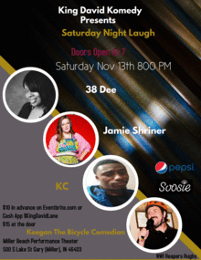 A great Saturday night of stand-up comedy featuring KC, 38 Dee, Jamie Shriner, & Keegan The Bicycle Comedian, & more live at the MillerNBeach PerforMance Theater! Doors open at 7 show runs 8-10!