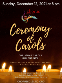 Chorus Eclectic in concert, under the direction of Alex Taite with pianist Danielle Naler, presents Ceremony of Carols on Sunday 12/12/21 at 5:00 pm.