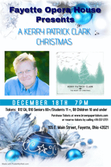 Accomplished musician, singer/songwriter, Kerry Patrick Clark, will once again grace the stage of Fayette Opera House with songs, stories and whimsical humor from his album The Heart of Christmas.