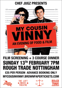The ticket price includes a screening of the 1992 American courtroom comedy My Cousin Vinny, and a Mexican-American three course meal lovingly prepared by Chef Jugz.