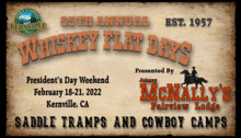 One of the most popular Festivals in all of Southern California. Just a short 3 hour drive from Los Angeles and 50 miles east of Bakersfield on Hwy 178, you will find the quaint town of Kernville, home to Whiskey Flat Days. Whiskey Flat Days is held every Presidents Day Weekend. It is a leap back to the good ol' Wild West Days when the area was settled by gold miners, cattle ranchers and trappers. Join us when Kernville reverts to its old name "Whiskey Flat" for four nostalgic days of fun for the entire family. Parade, Wild West Daze Rodeo, Wild West Encampment, Carnival Rides, Whiskey Flat Mayor Contest, Food & Craft Booths, Epitaph, Costume & Whiskerino Contests, Line Dancing, Pet Parade, Blue Grass & Country Western Music, Art Show, Gunfighter Skits, Kids Activities, Games, & much more!