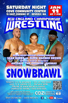 New England Championship Wrestling kicks off 2014 with SNOWBRAWL, on Saturdayday night, January 11th at the Cove Community Center, 19 East Corning Street in Beverly with a 7 PM bell time.