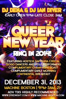Boston has never seen a Queer New Year quite like this before!!! Join us for an epic extravaganza presented by the combined forces of Machine Nightclub and Dyke Night and ring in the Queer New Year with a thousand moving bodies on one of the city's largest dance floors!