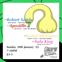 ~ Robert Sotelo (GLA - euros childs if euros childs dialled up the plonk - Upset The Rhythm) https://robertsotelo.bandcamp.com/releases ~ Sofa King (LDS/BHM - gloopy electronic transwave) www.xsofakingx.bandcamp.com ~ Isobel McKenna (GLA - klonky chillout, also transwave - Vivarium Sounds) https://vivariumsounds.bandcamp.com/album/bayat-yasity ~ Apostille (GLA - yelling electronic bloops man - Upset The Rhythm) https://apostille.bandcamp.com