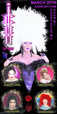 Welcome back to the ICON Show! We have a line up beyond compare for this one. Scheduled performers include--Mini Marks former Miss Continental, Charity Case former Miss Gay America, Liquor Mini former Miss Sober World and the hilarious Miss Everything-Cassie Nova. Doors open at 6 and the show starts promptly at 7. Don't be left out.