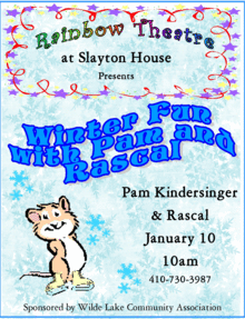 Rainbow Theatre at Slayton House will continue this season's series with a performance of "Winter Fun with Pam and Rascal" presented by Pam the Kindersinger on Friday, January 10, 2014. Interactive fun with songs, puppetry, storytelling and lots of humor. The performance is at 10:00am in the Slayton House Theatre in the Village of Wilde Lake in Columbia. Tickets may be purchased in advance for $5 each and may be available at the door for $6 each; exact cash or check only, no credit cards, no reservations and no refunds. Credit card purchases may be made at www.brownpapertickets.com. Group rates. For information call 410-730-3987 or email events@wildelake.org. Sponsored by Wilde Lake Community Association.