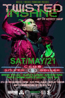 Nosenss Promotions Presents TWISTED INSANE Michael Johnson, known by his stage name Twisted Insane, is an American chopper rapper and songwriter from San Diego, California; previously affiliated with the Lincoln Park Bloods. He was signed to Liquid Assets Records until he founded the record label Brainsick Muzik in the late 2000s. Johnson has released nine studio albums, as well as multiple mixtapes and countless singles in his time active, the first of these albums, was released while the rapper was homeless and travelling around the United States. NOSENSS RECORDS ARTISTS/GHETTO RESIDENTS BREED THA LOC/SLEEK ILLANOIZ/ KHASHIS KING Local support performance by TWICH/GRIMM JUSTICE/ZELDA AMD MORE. Full bar with ID. 21+ Venue. Show starts at 9PM $20.00 Pre-Sale $25.00 at door. SATURDAY/MAY, 21ST. SILVER DOLLAR CLUB 400 COMMERCIAL ST. ELKO, NV.