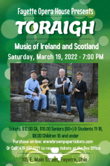 Toraigh (pronounced "Tory") is a Gaelic word that means "seek" or "search." Toraigh represents the search for great times by bringing people together with lively, toe-tapping, and heart-warming traditional music and dancing of Ireland and Scotland.